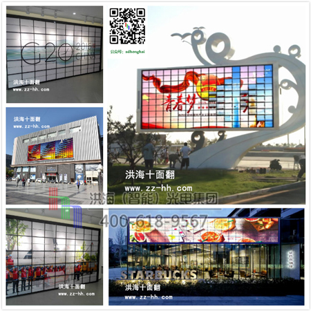 機(jī)械翻頁(yè)十面翻告別了傳統(tǒng)的機(jī)械傳動(dòng),取而代之是數(shù)控智能控制系統(tǒng)的應(yīng)用,化腐朽為神奇,以其波瀾壯闊的新奇和動(dòng)感效果橫空出世,在視覺(jué)疲勞中給人以清新、懷舊但又與眾不同的視覺(jué)感受。好的元素用于建筑、裝飾、場(chǎng)館、舞臺(tái)和戶外廣告,讓建筑動(dòng)起來(lái),就會(huì)賦予靈魂和創(chuàng)意,帶來(lái)更多價(jià)值。 創(chuàng)意無(wú)止境,廣告無(wú)邊界,洪海光電集團(tuán)帶您進(jìn)入時(shí)尚廣告前沿,來(lái)吧朋友們,與洪海共舞,打造您的財(cái)富空間!!!
