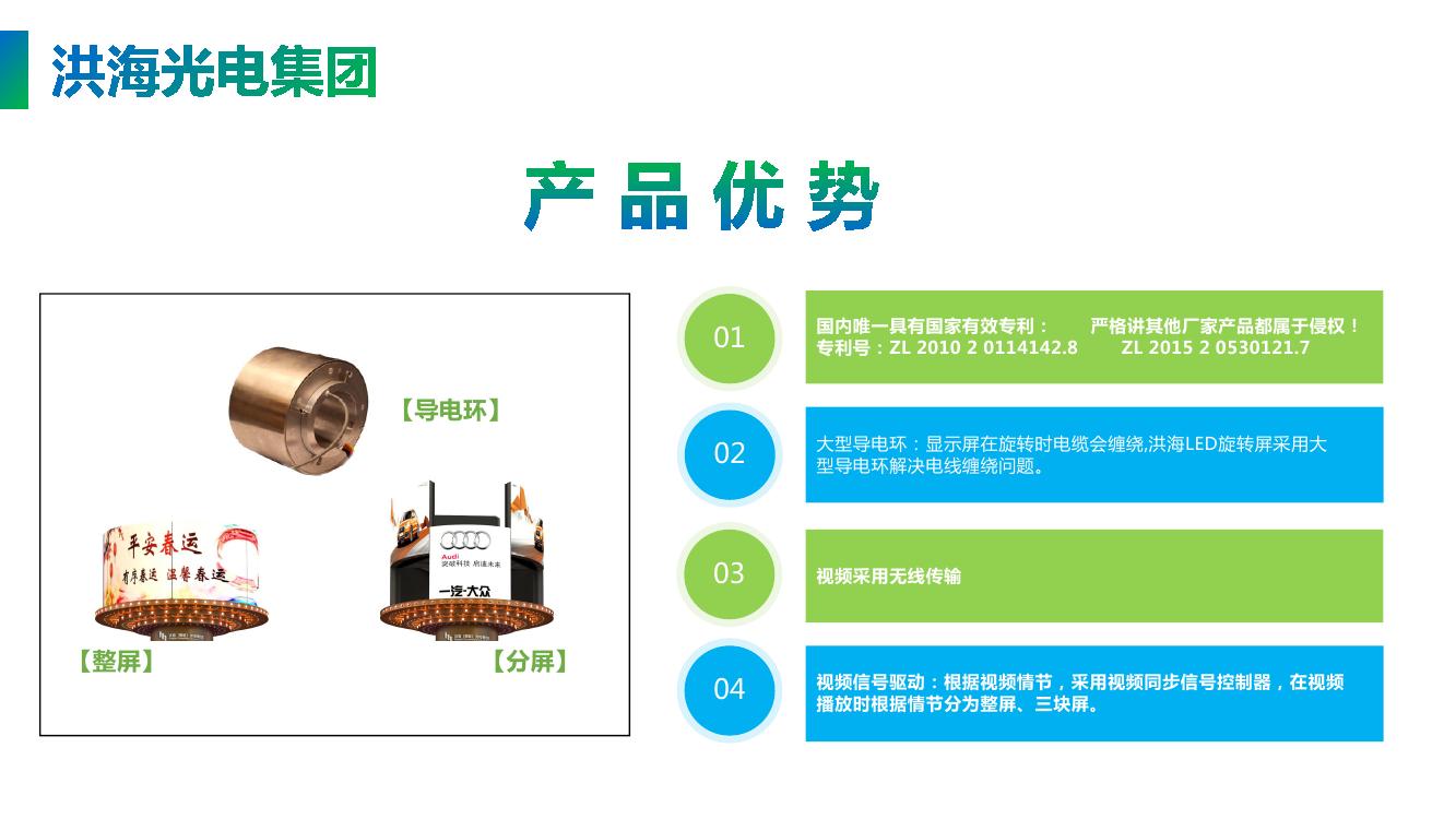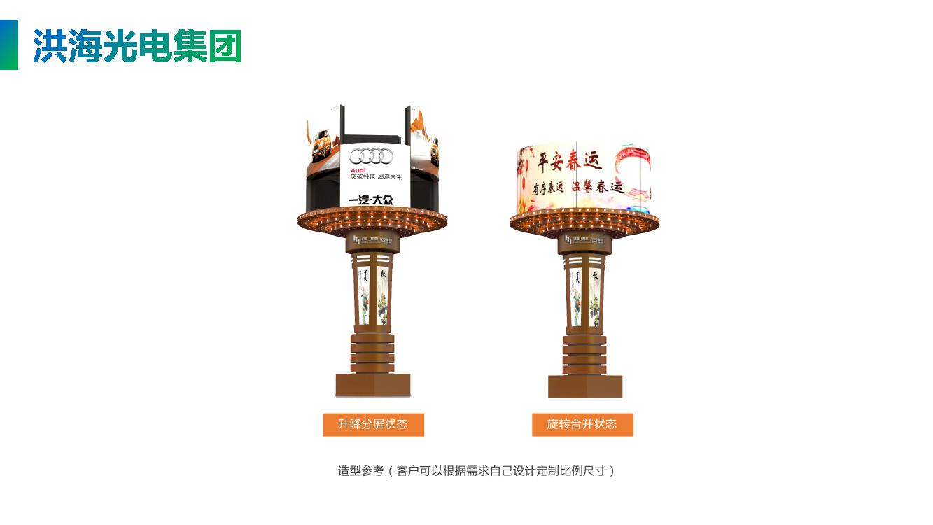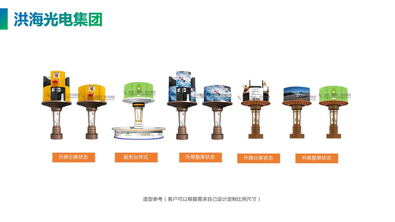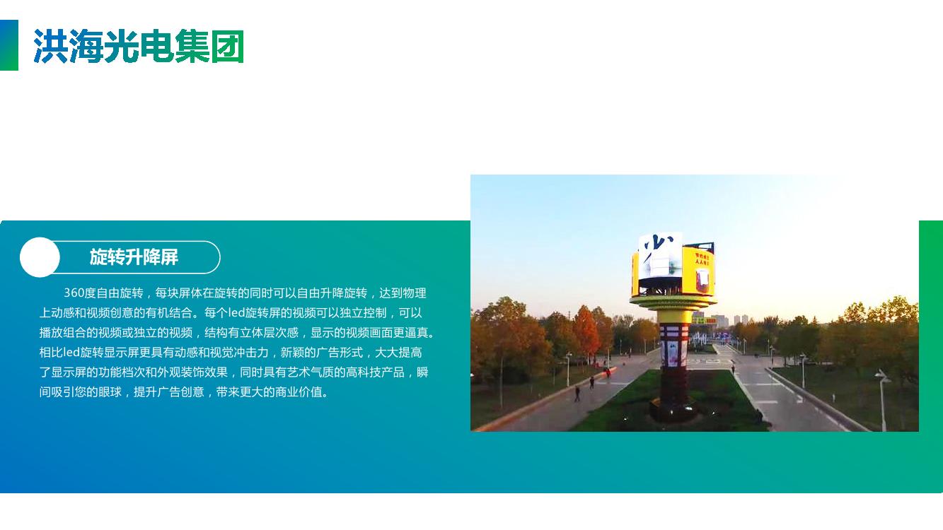 360度自由旋轉(zhuǎn),每塊屏體在旋轉(zhuǎn)的同時可以自由升降旋轉(zhuǎn),達到物理上動感和視頻創(chuàng)意的有機結(jié)合。每個led旋轉(zhuǎn)屏的視頻可以獨立控制,可以播放組合的視頻或獨立的視頻,結(jié)構(gòu)有立體層次感,顯示的視頻畫面更逼真。